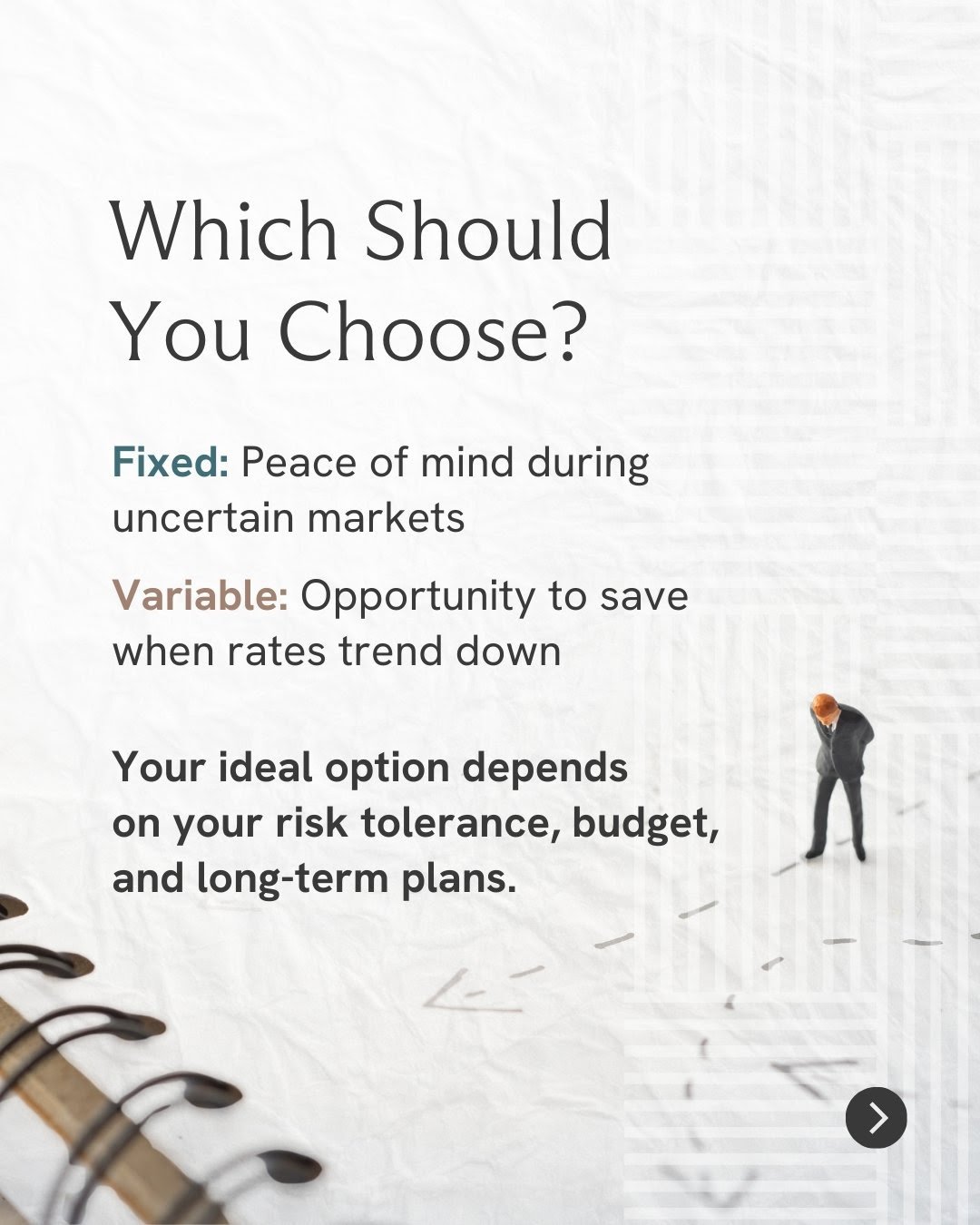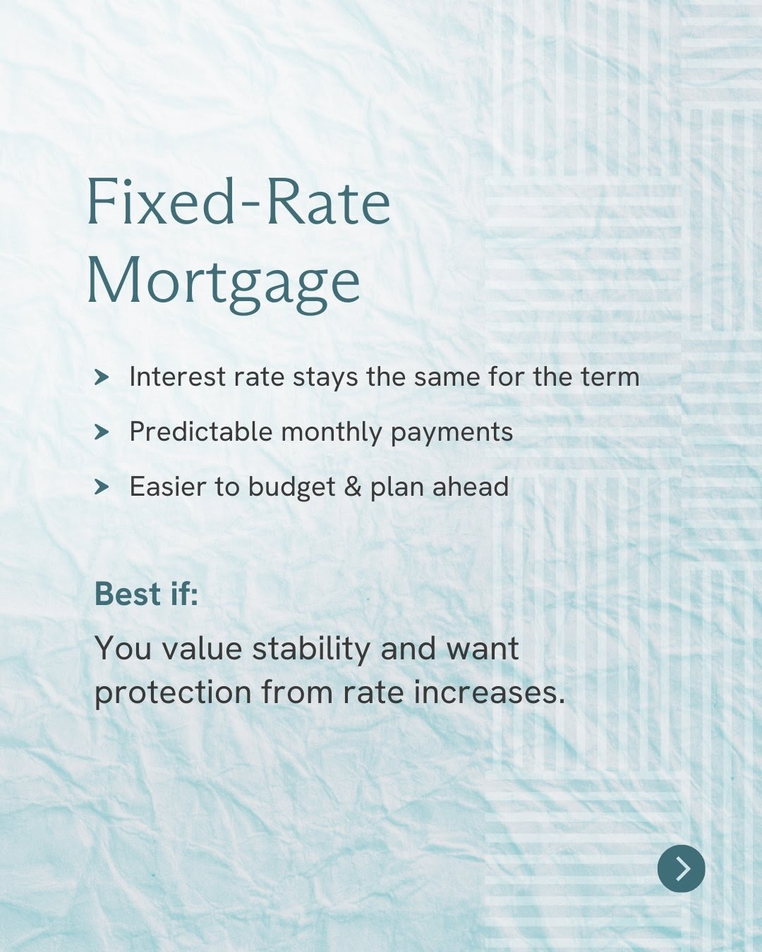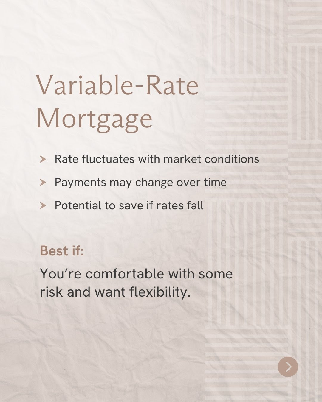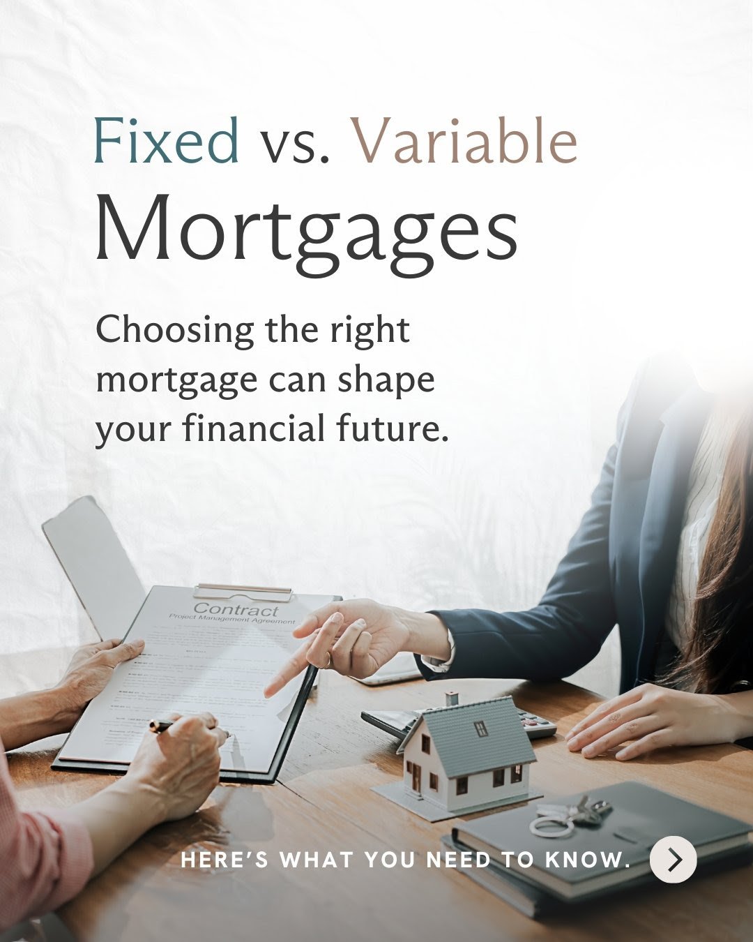 A fixed-rate mortgage offers stability with predictable payments, while a variable-rate mortgage can provide savings when interest rates trend down.