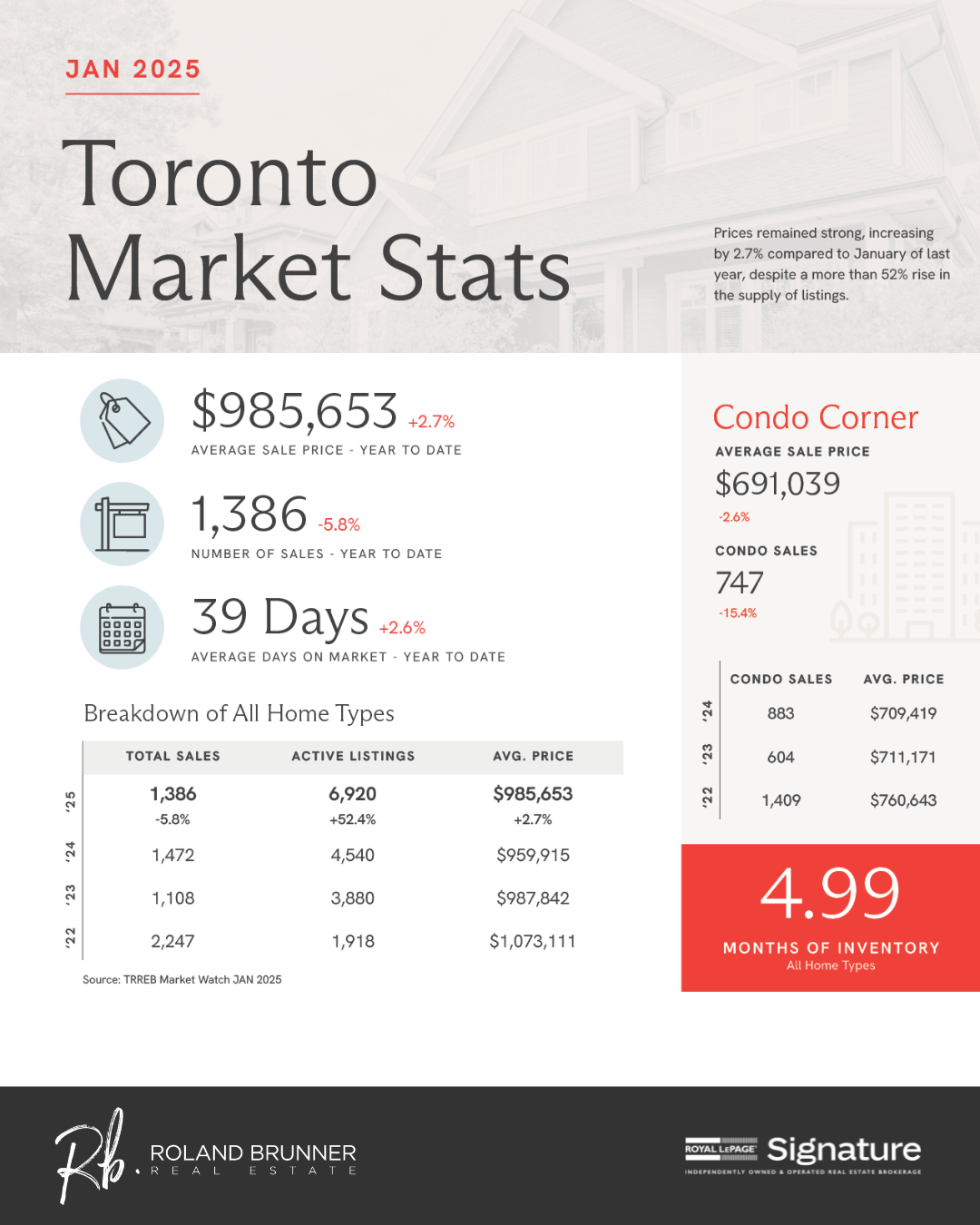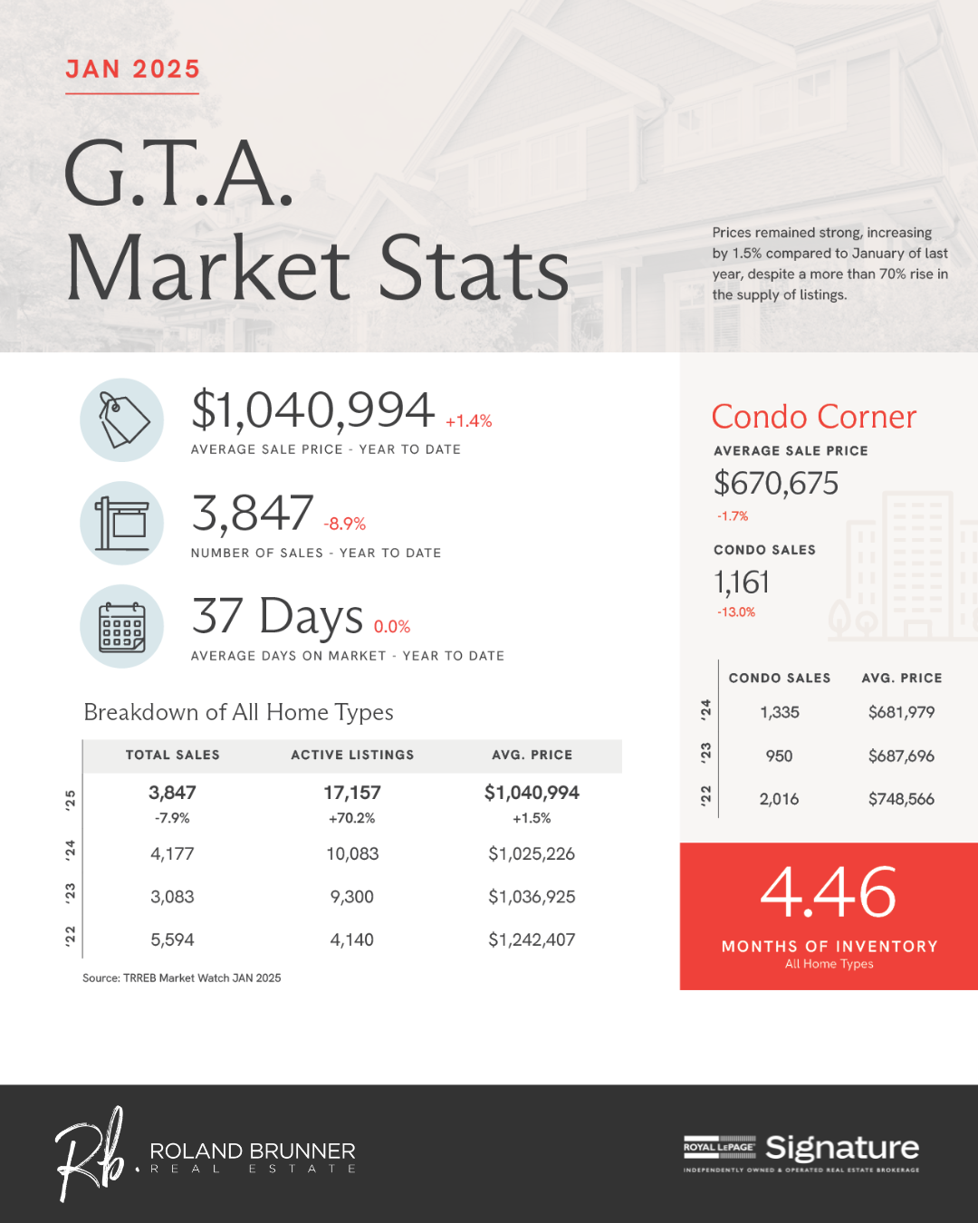 The condominium market in January softened with the number of sales down 13% and prices down only 1.7% across the GTA. Prices will remain relatively flat in the condominium market throughout 2025 as a record number of newly completed units are delivered across the GTA.